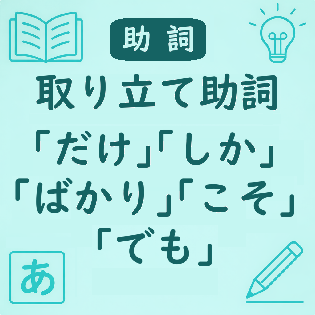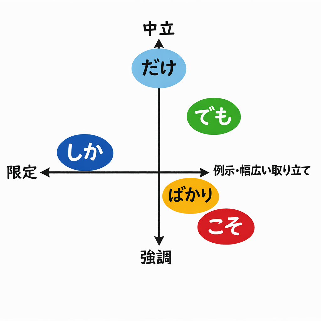 日本語には、数量・範囲・強調などを表す助詞がいくつもあります。特に だけ・しか・ばかり・こそ・でも は、意味が少しずつ違うため、学習者がよくまちがえるポイントです。